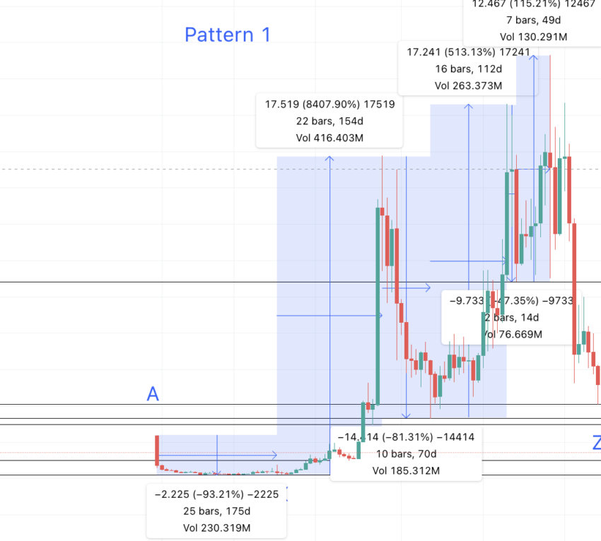 A a X = 175 dias e variação de -93,21%; X para B = 154 dias e 8407% de alteração; B a Y = 70 dias e variação de -81,31%; Y para C = 112 dias e 513,13% de alteração; C a Z = 14 dias e variação de -47,35%; Z a D = 49 dias e 115,21% de alteração.