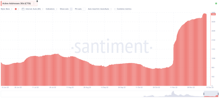 O gosto pelos tokens CTSI também parece estar crescendo. Verifique o número crescente de endereços ativos – uma métrica que disparou no último mês.