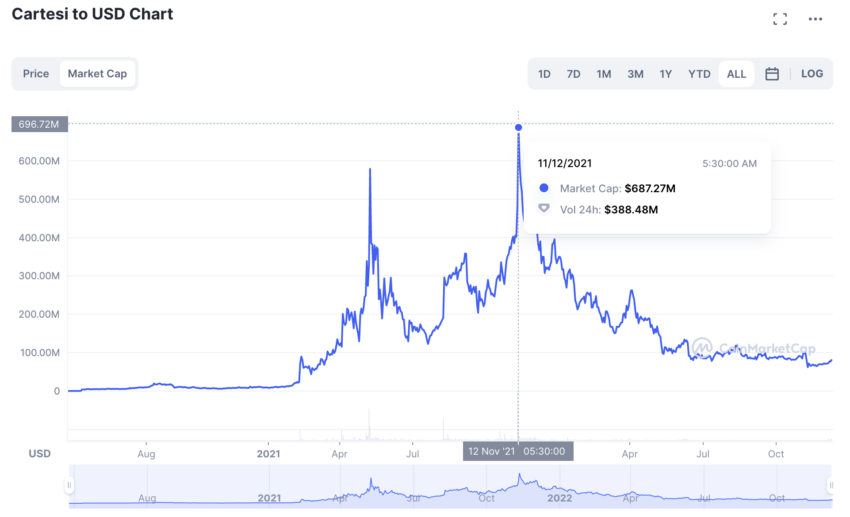 O valor de mercado da Cartesi foi o mais alto em 12 de novembro de 2021. Valor de mercado: US$ 687,27 milhões e volume de negociação: US$ 388,48 milhões. A relação entre o volume de negociação e a capitalização de mercado em 12 de novembro de 2021: 0,56.