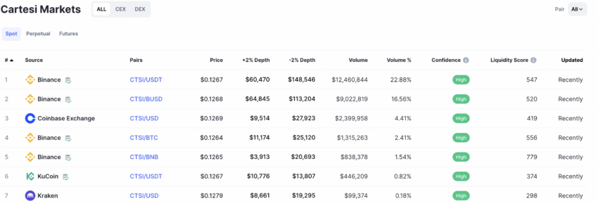 Chegando aos mercados de negociação, a CTSI tem um amplo spread de exchange. O par CTSI-USDT na Binance é o mais popular, detendo 22,88% do volume total de negociação CTSI no momento da redação deste artigo. A pontuação de liquidez também é boa o suficiente para mostrar uma ação de negociação decente.