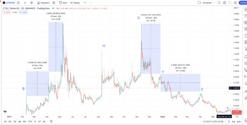 O CTSI começa no ponto (A), faz uma pequena alta (B), avança para fazer outra alta e atinge o pico em (D). Agora considere o ponto H, a máxima mais baixa como o ponto médio, inicia outro padrão com o pico em X. Em seguida, vem uma máxima mais baixa em Y, depois outra máxima mais baixa em Z e, finalmente, o nível atual (O).