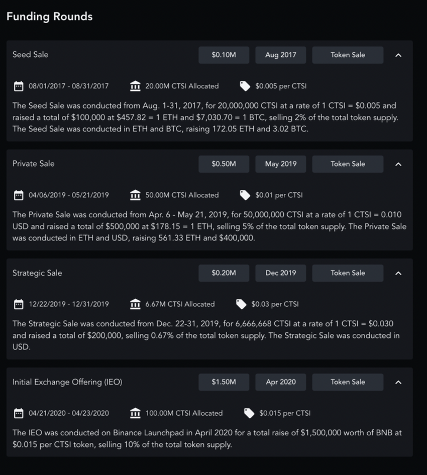 Se você observar o instantâneo acima, fica claro que os tokens CTSI foram oferecidos como parte de várias iniciativas de venda. Isso inclui uma venda de sementes, venda privada, saquê estratégico e IEO. Observe que o IEO apoiado pela Binance foi concluído em 23 de abril de 2020, após o qual o CTSI foi listado na Binance. Em breve chegaremos à tabela de preços.