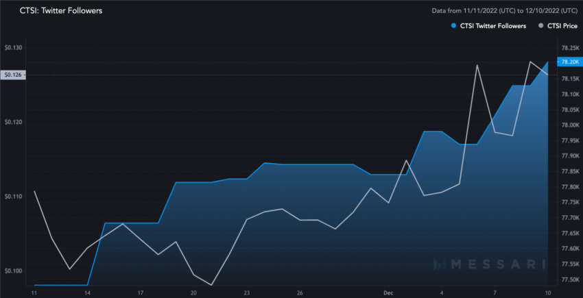 Portanto, os seguidores da Cartesi no Twitter parecem positivamente correlacionados com a ação do preço do CTSI.