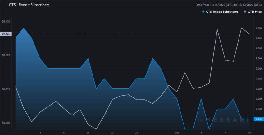 Os assinantes do Reddit da Cartesi caíram nos últimos 30 dias. Isso pode ser devido à falta de revelações interessantes sobre o crescimento do projeto. No entanto, os preços subiram durante esse período, significando que a maioria das mãos estava ocupada acumulando.