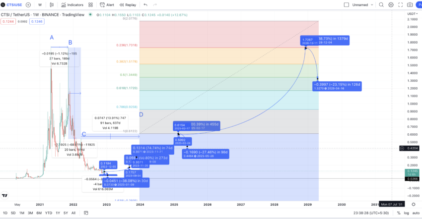 Uma vez que o CTSI recupere uma alta histórica, podemos esperar um crescimento exponencial em seu preço. Por isso. Vamos usar os níveis Fib no ponto 2028.