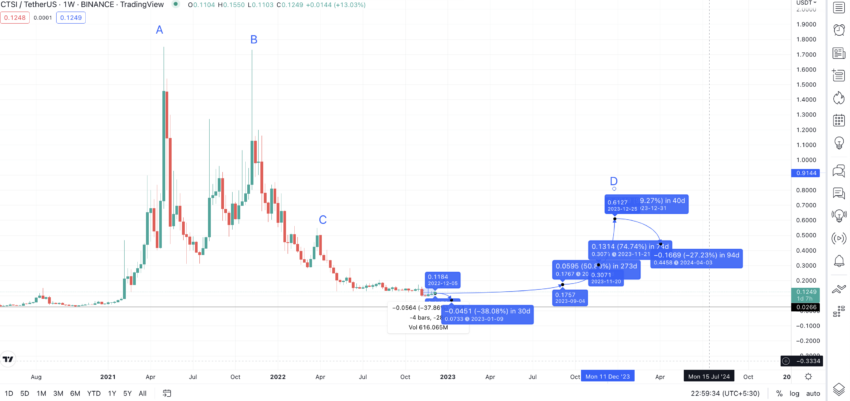 O padrão de alta mais baixa é quebrado em D, que é a alta projetada para 2025. Isso pode iniciar uma recuperação maior no balcão do CTSI de 2025 a 2030.