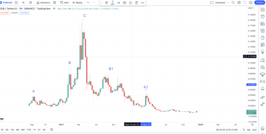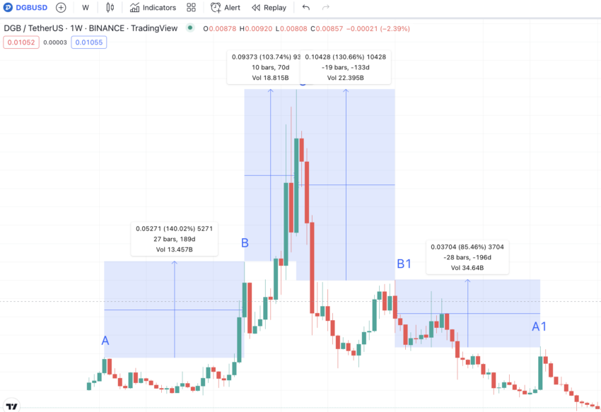 Em C1, o preço futuro do DGB teria ultrapassado várias outras máximas, como A1 e B1. No entanto, se olharmos para o padrão maior, o objetivo imediato de curto prazo para o DGB pós-2025 seria romper o nível B. Esta é a única alta abaixo do ponto alto de todos os tempos do DGB de US$ 0,1825.