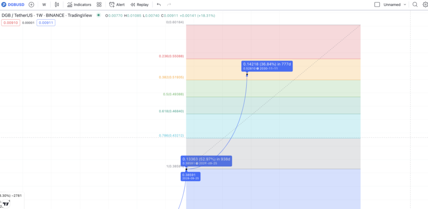 Agora, se usarmos o indicador Fib no ponto 2026, o mesmo se estende a um mínimo de US$ 0,384 até 2028. Além disso, mantendo em consideração o crescimento de preço morno, mas sustentado, do DGB, os níveis Fib, para a mesma inclinação, colocam a previsão de preço do DigiByte para 2030 em torno de US$ 0,528.