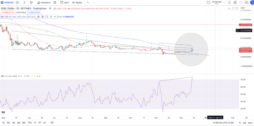 As médias móveis (50, 100 e 200) dão a confirmação final de uma alta. Se as médias móveis de 50 e 100 dias (vermelho e verde) cruzarem acima da mais alta, podemos esperar uma alta no DGB. Isso pode levá-lo à alta projetada de 2023.
