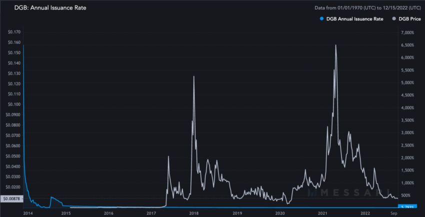 Atualmente, o DGB tem uma taxa de emissão anual de 5,57%, que diminui a cada ano — tornando o DGB desinflacionário. Até 2035, espera-se que todas as moedas DGB sejam extraídas, fazendo com que a motivação da escassez seja ativada.