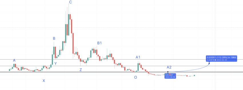 Se traçarmos a linha de previsão de A2, a mínima chega a 0,00737 ou X1 . Veja que demorou 91 dias para atingir essa mínima, que é uma variação esperada no mercado baixista. A formação baixa, conforme nossa projeção e cálculo, é um sucesso, conforme revela o caminho.
