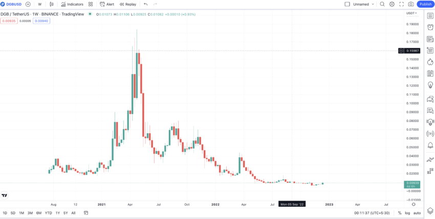 - O preço do DGB atingiu o pico em 1º de maio de 2021, atingindo US$ 0,1825.