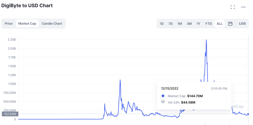 - Mais ou menos na mesma época – 3 de maio de 2021 – a DGB atingiu uma capitalização de mercado criptográfica de US$ 2,25 bilhões, a mais alta.