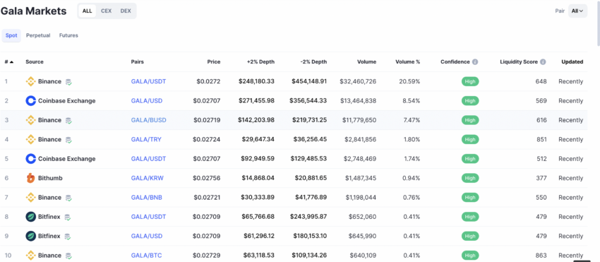 Entre os pontos positivos estão os mercados de negociação à vista generalizados com liquidez decente e altas pontuações de confiança. Como esperado, o par GALA-USDT é o mais popular. Além disso, GALA é um token negociável em DEX, com o SushiSwap suportando-o atualmente.