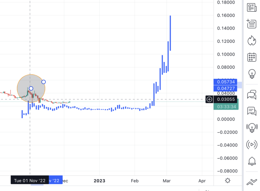 O contador da GALA experimentou um pequeno aumento de preço em 1º de novembro de 2022. Do Ponto F a 1º de novembro, existem 180 barras (aproximadamente). Assim, se o padrão de foldback for respeitado, a próxima alta deve ocorrer em maio de 2023.