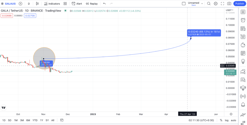 Agora que está estabelecido que a GALA atingirá uma alta em maio de 2023, vamos determinar qual poderia ser esse nível.