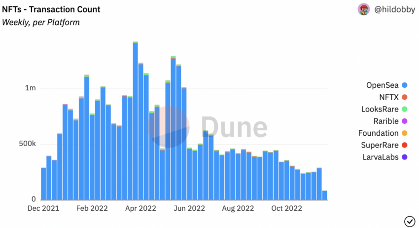 Os volumes de NFT e a contagem de transações diminuíram constantemente em 2022. O volume de negociação caiu 75% em comparação com o segundo trimestre de 2022.