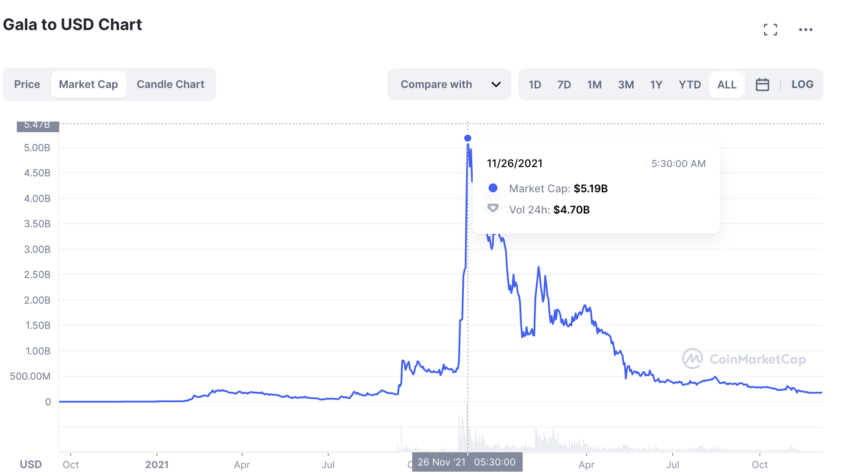 2. O valor de mercado da GALA foi o mais alto em novembro de 2021, quando estávamos no final da alta. Estava em US$ 5,19 bilhões. Agora é menos de US$ 192 milhões.