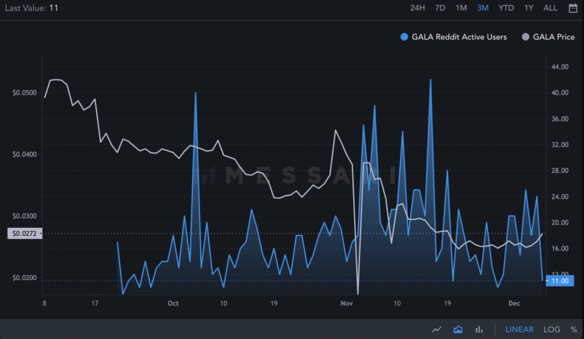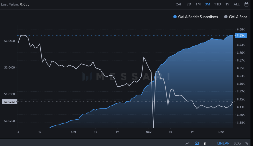 Além disso, a GALA teve um aumento de 38,1% nas menções sociais nos últimos três meses. Os usuários ativos do Reddit diminuíram durante o mesmo período. No entanto, os assinantes do Reddit dispararam.