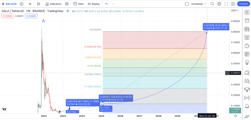 Para prever o preço dos tokens GALA em 2030, um gráfico semanal pode nos ajudar a considerar um período de tempo mais amplo. Se colocarmos os níveis de Fib nos máximos de 2025, a GALA poderá chegar a US$ 0,80 em meados de 2030. Isso seria próximo da alta histórica de US$ 0,83.