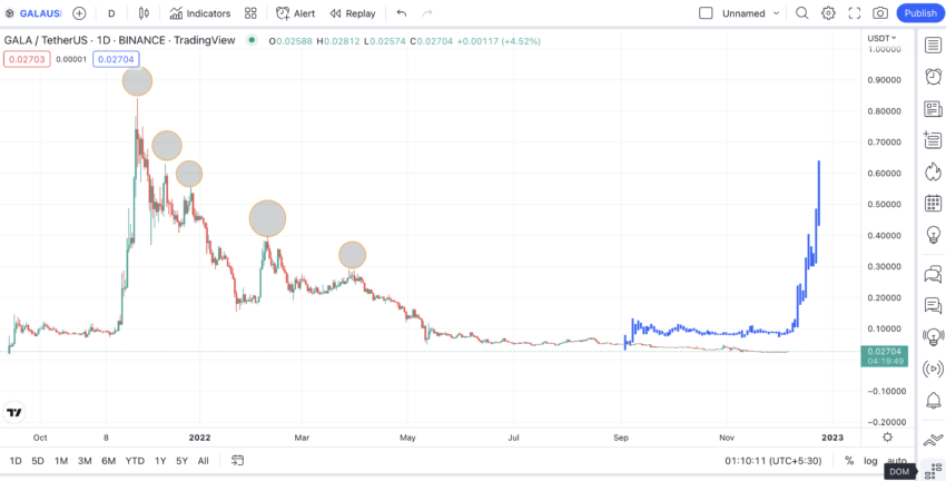 Aqui está uma visão panorâmica do gráfico diário da GALA. Houve um movimento de limite de alcance estendido no balcão da GALA de maio de 2022 em diante. No entanto, antes disso, a GALA fez um padrão de swing-high, com máximos mais baixos marcados por círculos.