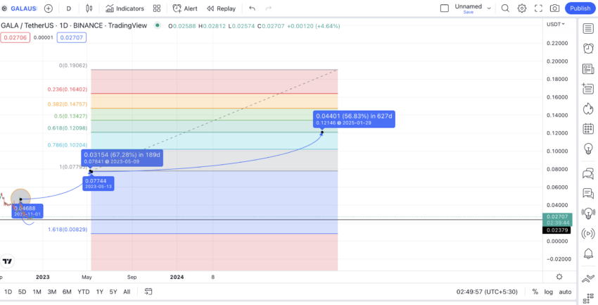 Agora extrapolando e considerando que a GALA segue um padrão de crescimento linear, a projeção de preço para 2025 poderia ser de US$ 0,12146. Podemos determinar os mínimos usando a métrica de retração Fib para ver onde os preços da GALA podem cair.