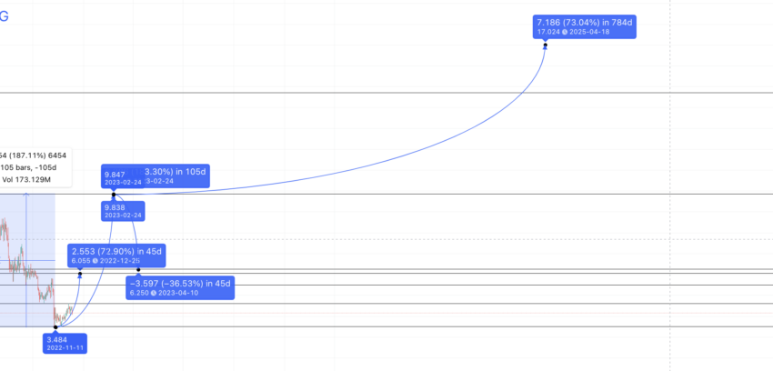 Vamos ver quanto os tokens ICP caíram da alta de 2023 para a baixa de 2023. De US$ 9,85 para US$ 6,250, a queda foi de 36,53%. Portanto, se a tendência de alta continuar, a queda máxima do ICP em 2025 é de 36,53%.