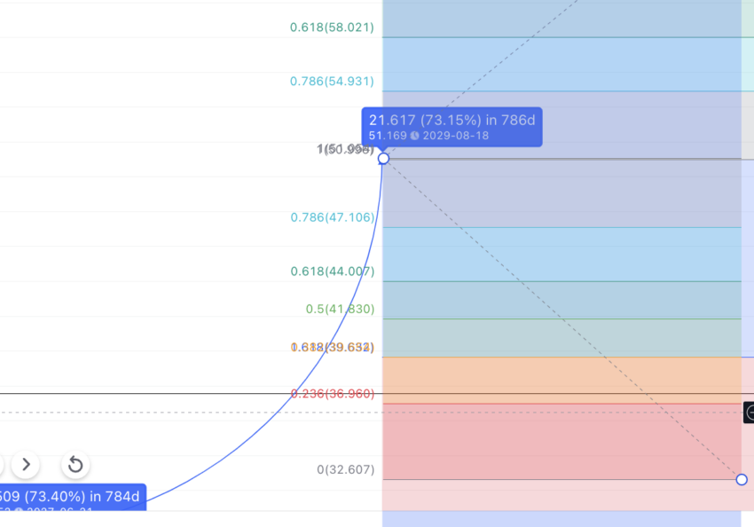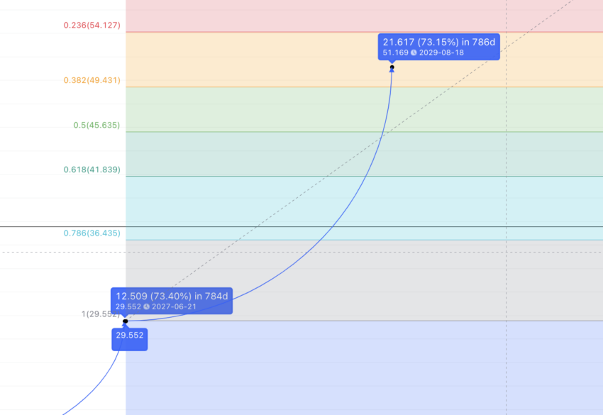 Agora vamos colocar o indicador Fib na alta de 2027. Traçando o mesmo caminho de 784 dias e uma alta de 73%, chegamos a US$ 51,169 em 18 de agosto de 2029.