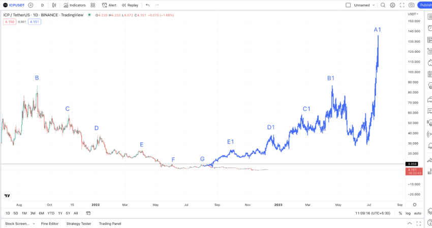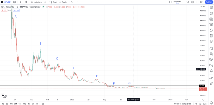 Seguindo o padrão, o ICP deveria atingir US$ 17,21 em outubro. Em vez disso, caiu para US$ 3,5 devido ao bear market. No entanto, o padrão ainda se mantém. Desta vez, o primeiro nível de violação do ICP seria de US$ 9.858. Somente depois de chegar lá ele pode se mover ao longo do caminho projetado de G.