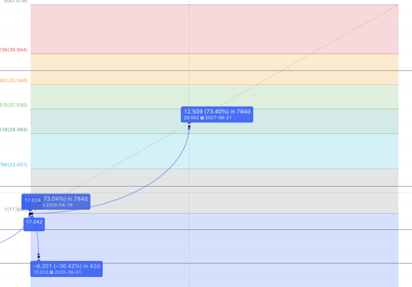 Além disso, se o mesmo caminho for refeito – 784 dias e um movimento de alta de 73% – podemos esperar que o ICP atinja US$ 29,552 em 2027. Esse nível é um pouco mais alto do que o nível Fib de 61,80% de 28,493. A baixa para 2027 pode estar no nível Fib de 78,60% de US$ 23,45.