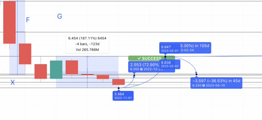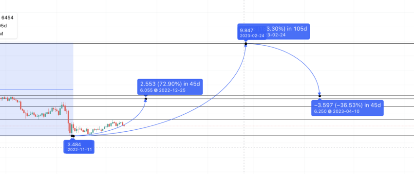 Além disso, se nos referirmos à tabela acima, o tempo médio de alta a baixa é de 45 dias. Portanto, a mínima pode estar em qualquer lugar por volta de 10 de abril de 2023.