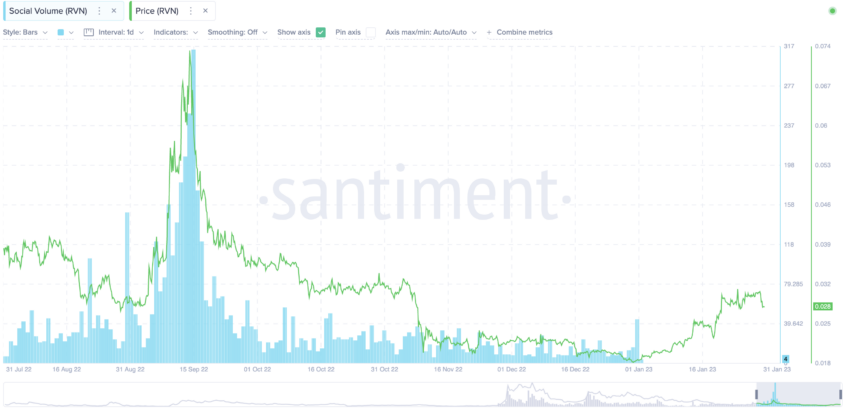 O gráfico histórico do volume social mostra que qualquer atividade social relevante para a Ravencoin pode gerar um aumento de preço.