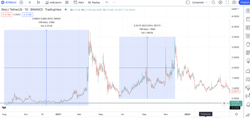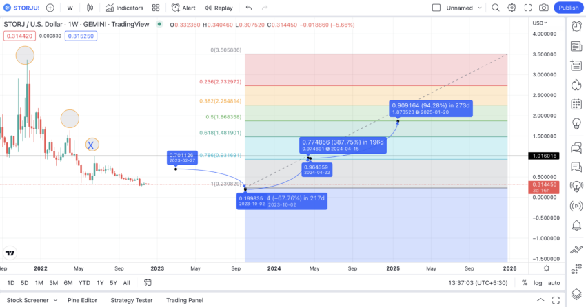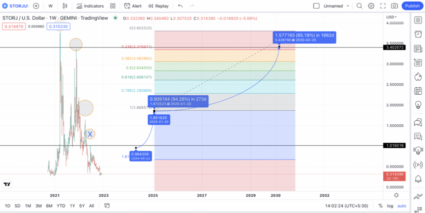 Se seguirmos esse ritmo e intensidade de extrapolação, o STORJ pode chegar a US$ 1.873 no início de 2025.