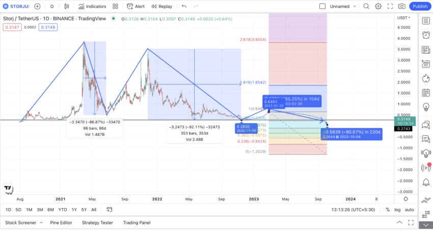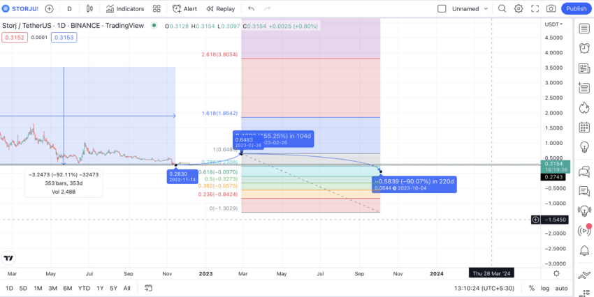 Se o mercado de baixa ceder, a próxima baixa possível pode ser de US$ 0,2308, de acordo com os níveis de retração de Fibonacci. Portanto, STORJ pode não sair do padrão de baixa mais baixa e alta mais baixa em 2023. O padrão continua.