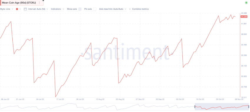 A idade média anual da moeda está subindo, mostrando que os detentores de STORJ não estão simplesmente vendendo neste mercado em baixa. Portanto, as perspectivas são positivas.