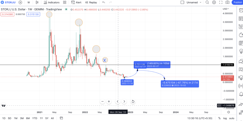 Para a previsão do preço do STORJ de médio prazo, vamos ao gráfico semanal. Aqui, podemos plotar a alta e a baixa do próximo círculo para verificar os padrões.