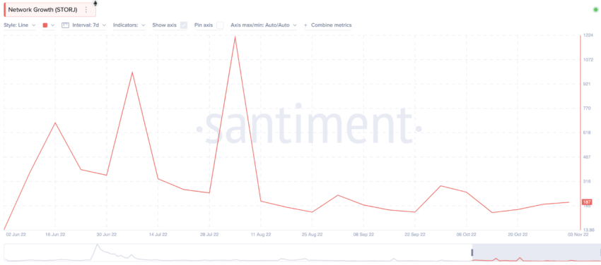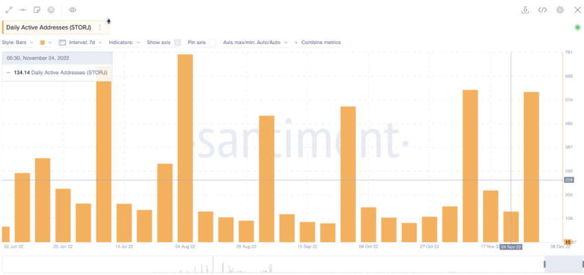Além disso, as menções sociais atingiram o pico em 22 de novembro de 2022, quando STORJ viu alguma ação de preço positiva. Suas menções sociais aumentaram 33% no trimestre.
