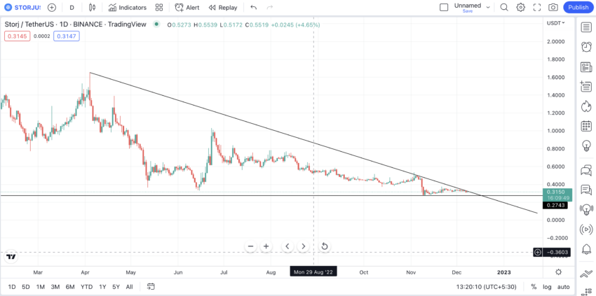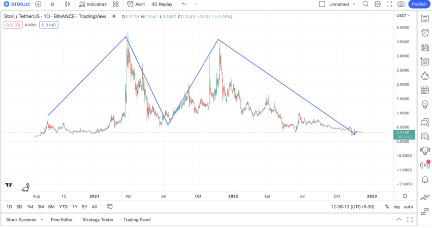 Aqui está o gráfico diário de preços da STORJ com um padrão claro: