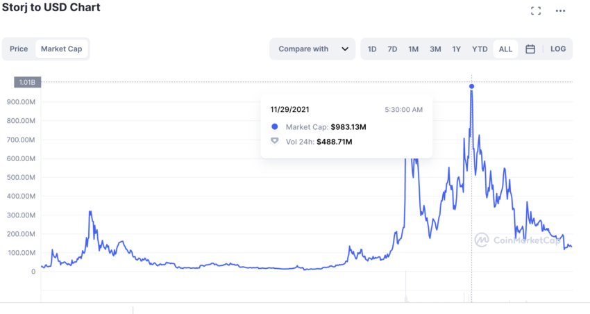 O STORJ teve o maior valor de mercado em 29 de novembro de 2021, quando atingiu US$ 983,31 milhões, com um volume diário de negociação de US$ 488,71 milhões.