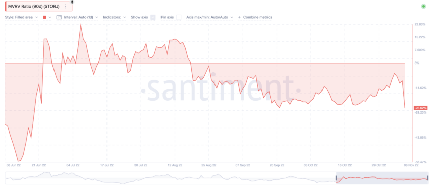 Do ponto de vista do investidor, aqui está o índice MVRV (valor de mercado para valor realizado) de 90 dias. A partir de novembro de 2022, o índice MVRV é negativo, significando que o STORJ está subvalorizado. As pessoas estão dispostas a segurar e não vender: um sinal positivo no curto prazo.
