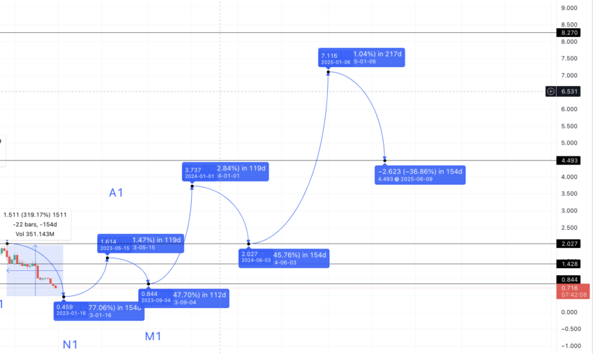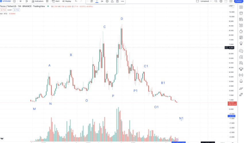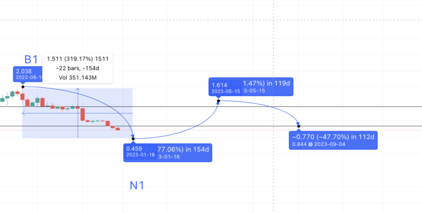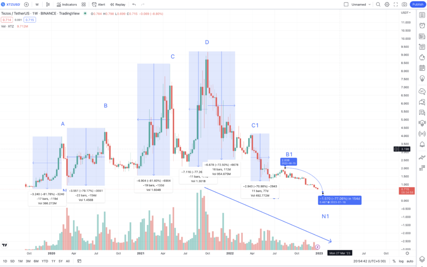 Se traçarmos o caminho de N1, a próxima alta, ou A1, aparecerá em US$ 1,614. Esse nível pode surgir em agosto ou setembro de 2023. A próxima queda, ou M1, pode ocorrer em 112 dias. Se seguirmos a queda média de -77,215%, a mínima pode chegar a US$ 0,374. No entanto, considerando a análise de desempenho do Tezos e a crescente popularidade do NFT e do contrato inteligente, a baixa pode receber suporte em US$ 0,844 (usando a teoria da linha de suporte).