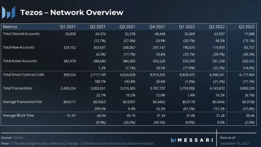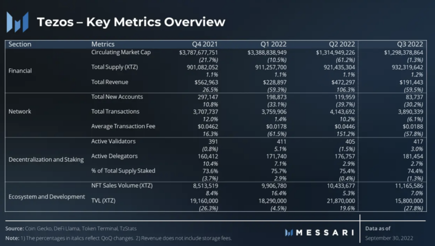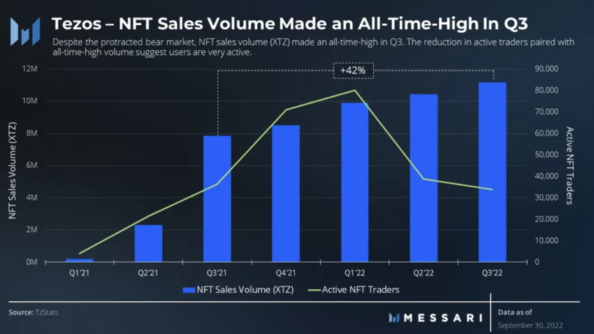 O relatório do Tezos da Messari para o terceiro trimestre de 2022 afirma que o volume de vendas de NFT aumentou quase 7%. A presença do DeFi foi afetada, no entanto, com o TVL caindo quase 28% no trimestre em 30 de setembro.