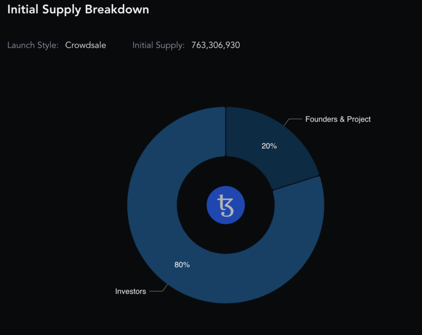 É importante observar que o Tezos não possui um suprimento limitado. Simplificando, o modelo tokenomics é inflacionário. Além disso, a taxa de emissão anual é de 4,5%. Atualmente, quase 943 milhões de tokens atingem a oferta total. Quase 922 milhões fazem o abastecimento circulante. Por fim, a distribuição inicial da oferta mostra que a maioria dos tokens pertence aos investidores, tornando o modelo de token bastante transparente.
