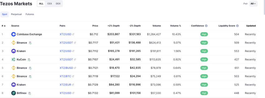 No que diz respeito à atividade comercial, a presença do Tezos no mercado spot é bastante forte. Os pares XTZ-USD e XTZ-USDT na Coinbase e Binance ocupam a maior parte do volume de negociação.