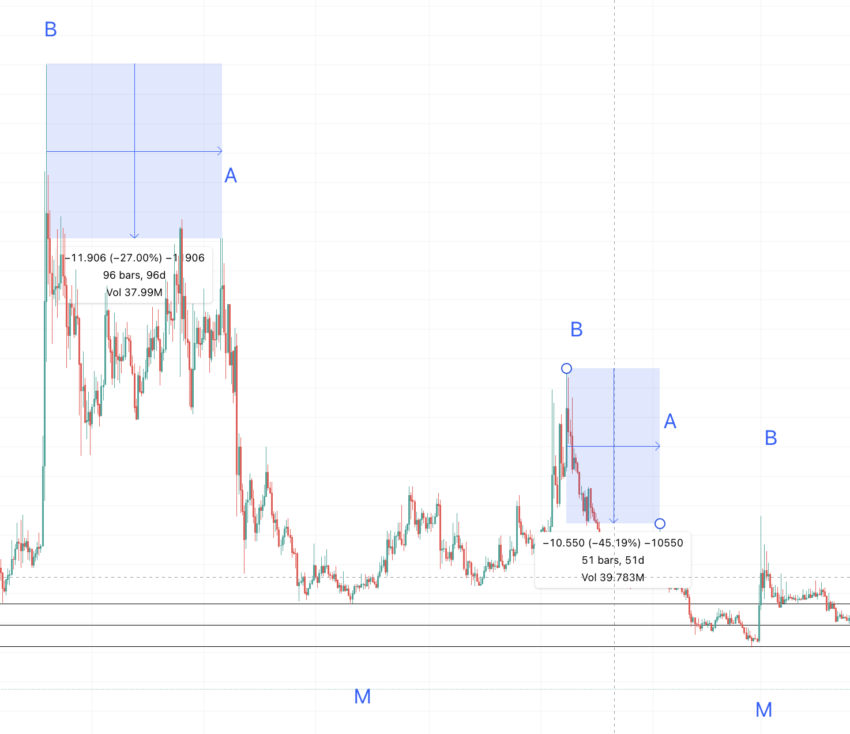 Agora, se pegarmos os dados médios de todos os níveis de A a M usando as tabelas acima, obtemos a mudança de preço e a distância de 49 dias (máximo de 72 dias) e uma queda de 71,59%. O nível chega a US$ 0,713. Assim, em 2023, podemos esperar uma rápida correção no balcão da UMA.