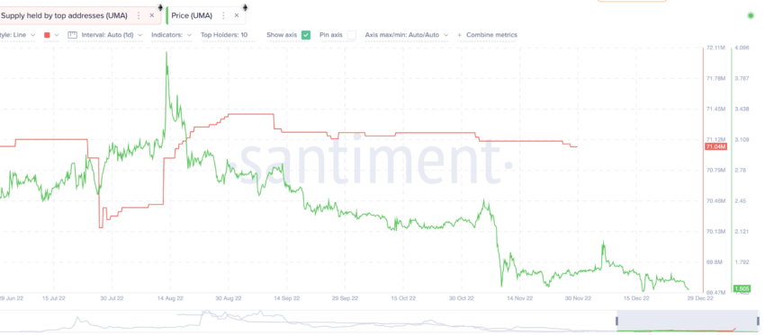Mencionamos anteriormente que os 100 maiores detentores de UMA acumulam a maior parte do suprimento. Aqui está um gráfico que mostra que, embora eles não tenham despejado, o preço dos tokens UMA ainda está caindo. Além disso, foi no final de julho que a oferta de endereço principal caiu e os preços responderam positivamente. Portanto, podemos esperar outro aumento se o suprimento mantido pelos principais endereços cair.