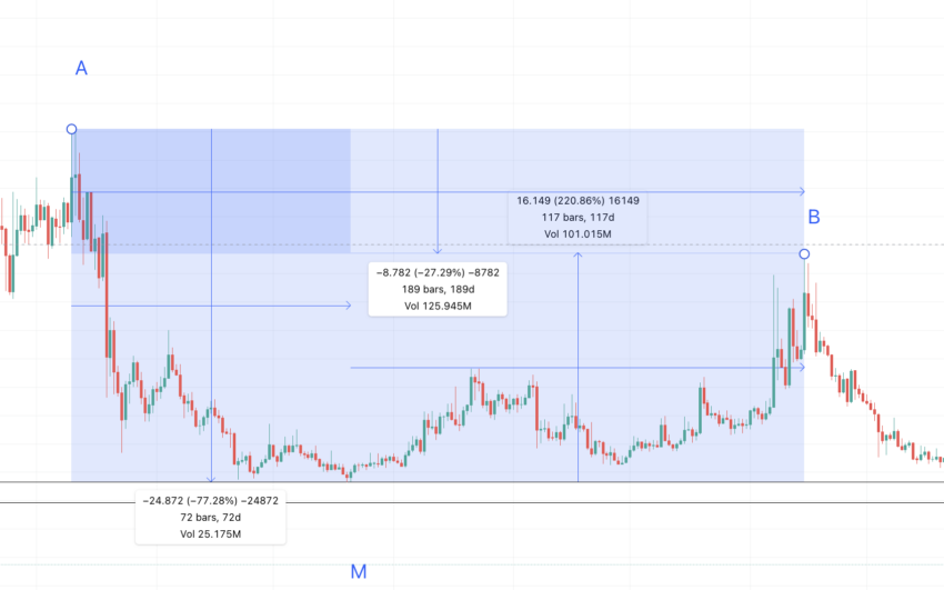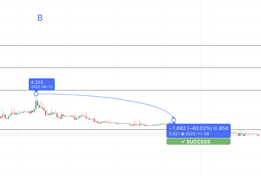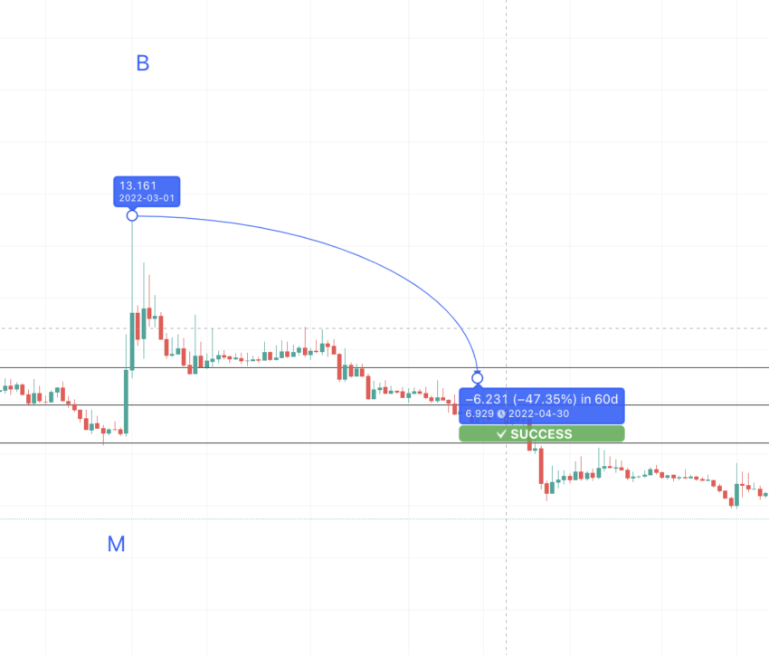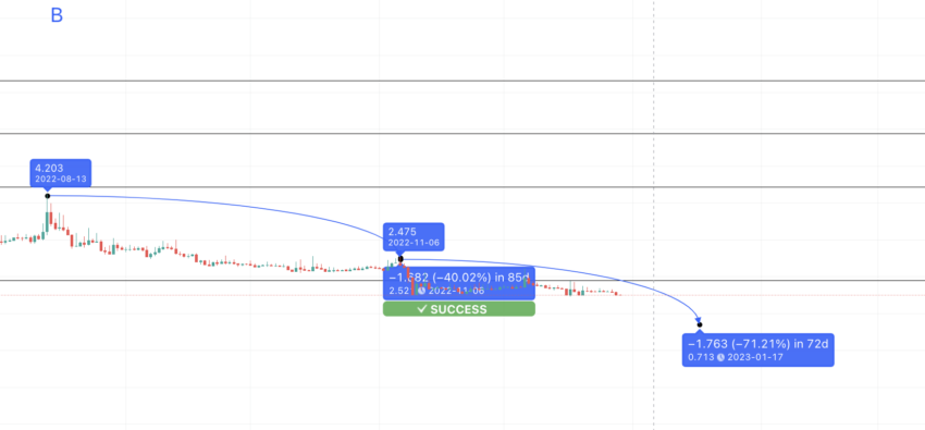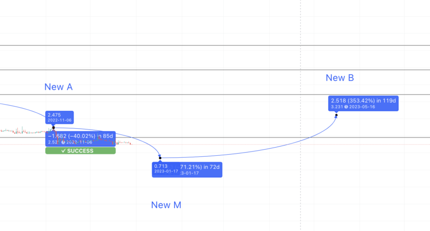 A variação média do preço é: 355,43% desde a última baixa ou novo M. A distância pode chegar a 119 dias, pois ainda estamos em um mercado em baixa. Agora, se traçarmos o caminho do Novo M ou US$ 0,713, o Novo B pode chegar a US$ 3,21 em meados de 2023.
