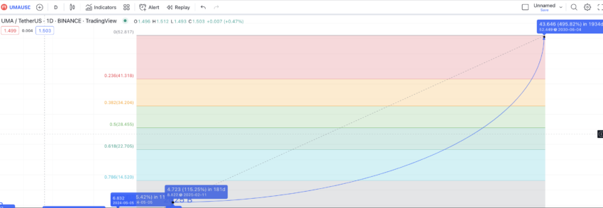 Agora que temos a alta dos tokens UMA em 2025 e até o preço mínimo em 2024, podemos conectar os pontos usando os níveis Fib. Conectar o 2024 A e o 2025 B extrapola os preços do token UMA para US$ 52,45 em meados de 2030.
