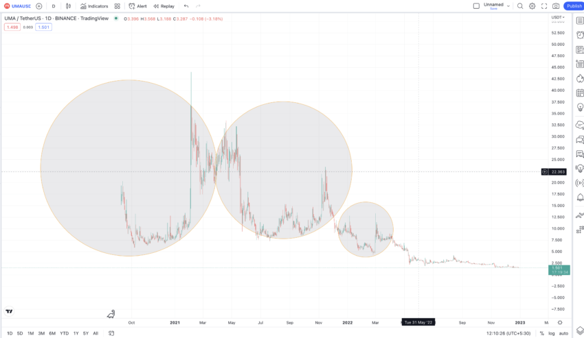 Observe que os altos e baixos de um determinado ano podem variar dependendo do estado do mercado de criptomoedas. Portanto, a análise técnica para tokens UMA (Universal Market Access) pode mudar de acordo.