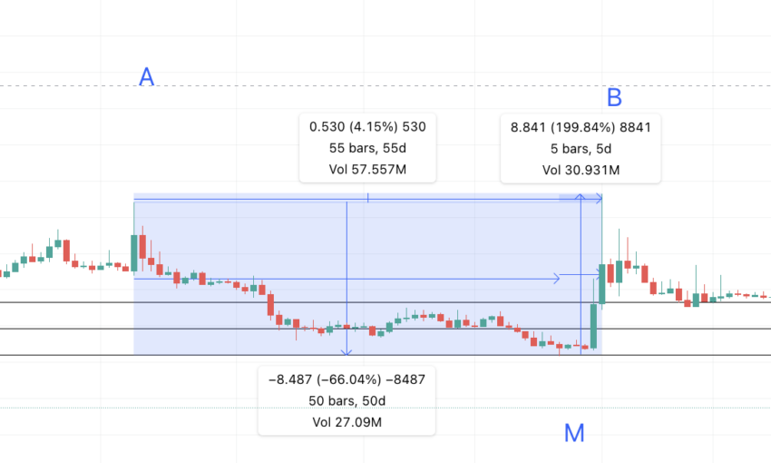 A a M = 50 dias e variação de preço de -66,04%; M para B = 5 dias e 199,84% de variação de preço; A a B = 55 dias e 4,15% de variação de preço.